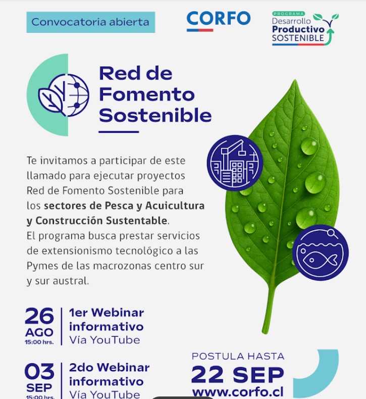 La iniciativa, apoyada por el Programa de Desarrollo Productivo Sostenible (DPS), liderado por el Ministerio de Economía, Fomento y Turismo y Corfo, busca entidades con el potencial de implementar planes de atención especializados para modernizar los procesos productivos y la sostenibilidad de las Pymes en los sectores de pesca, acuicultura y construcción sustentable.