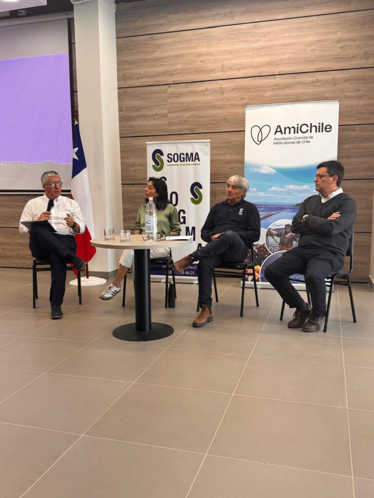 Una de las novedades de este Seminario, fue la incorporación de temas de innovación aplicada a la mitilicultura y se realizó un panel de conversación, donde participaron María José Urrutia es una voz destacada en innovación y sostenibilidad dentro del ecosistema del sur de Chile. Como fundadora y directora general de Këtrawa, lidera iniciativas que impulsan soluciones climáticas y el crecimiento de la economía azul y promueve el Patagonia Ocean Hub; Alejandro Clément Díaz es biólogo marino titulado de la Universidad de Concepción y magíster en Ciencias por la Oregon State University (EE.UU.). Su trabajo se centra en el estudio y monitoreo de floraciones de algas nocivas (FAN) y mareas rojas, aplicando tecnologías como sensores remotos e imágenes satelitales para el análisis del color del océano y ecosistemas costeros y Arturo Navarrete abogado de profesión y en la actualidad es parte de SOGMA, empresa con proyectos relacionados a la valorización de la conchilla de choritos y su utilización como estabilizador de caminos.