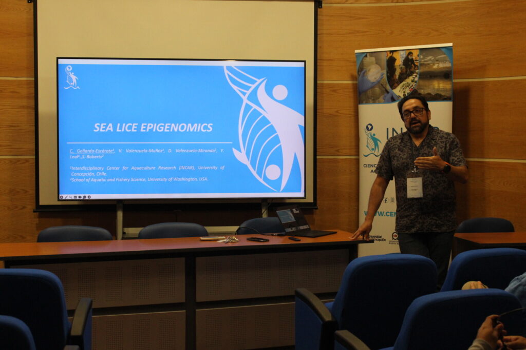 La jornada de la tarde en EpiAqua comenzó con la presentación «Sea Lice Epigenomics», del Director del Centro INCAR², Dr. Cristian Gallardo-Escárate, en la que destacó la importancia de la herramienta epigenómica en la acuicultura en el combate contra el Caligus.