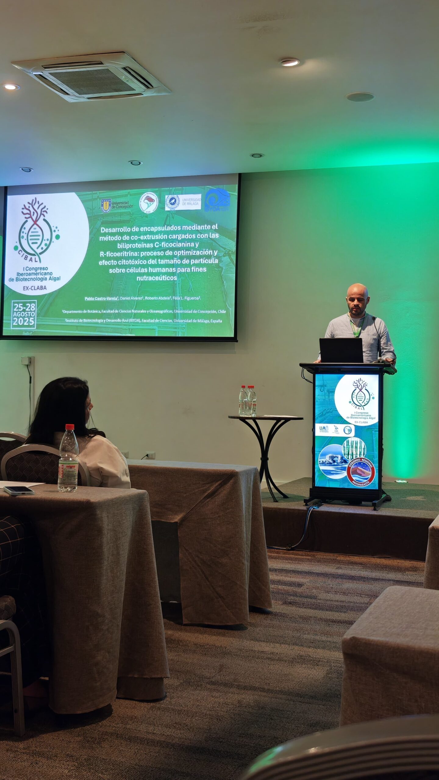 Finalmente, el académico del Departamento de Botánica e investigador de Ficolab, Dr. Pablo Castro Varela, expuso el trabajo «Desarrollo de encapsulados mediante el método de co-extrusión cargados con las biliproteínas C-ficocianina y R-ficoeritrina: proceso de optimización y efecto citotóxico del tamaño de partícula sobre células humanas para fines nutracéuticos», fruto de su colaboración con el proyecto internacional Nazca (Blue Nutricosmeceuticals with Cyanobacteria and Macroalgae) de la Universidad de Málaga (España).