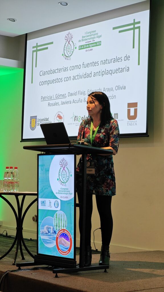 La Dra. Patricia Gómez, Directora de Ficolab, presentó el trabajo “Cianobacterias como fuentes naturales de compuestos con actividad antiplaquetaria”, una investigación conjunta con el Centro de Investigación en Trombosis y Envejecimiento Saludable de la Universidad de Talca.
