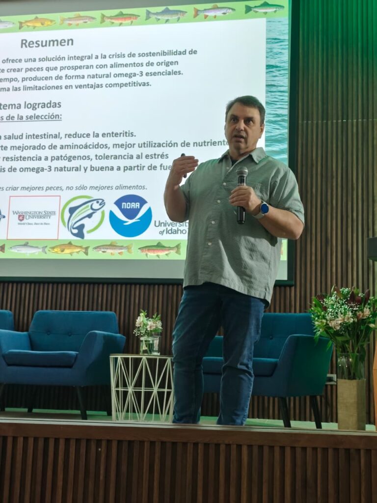 Desde Idaho, el Dr. Kenneth Overturf presentó una visión complementaria: si cambian los alimentos, los peces pueden evolucionar para mejorar la utilización de dietas formuladas con materiales vegetales.