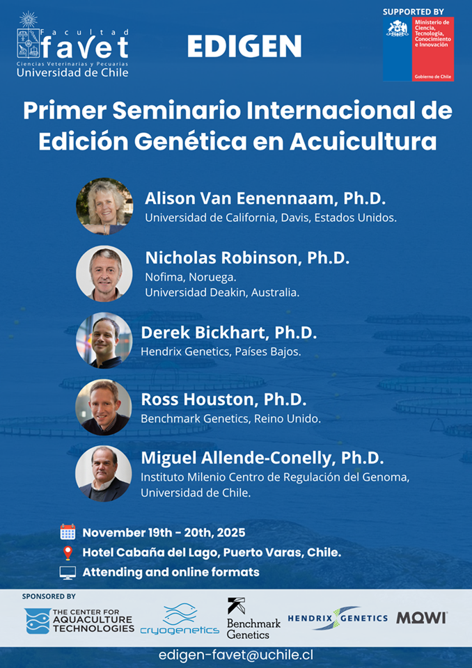 Organizado por el equipo de EDIGEN de la Facultad de Ciencias Veterinarias y Pecuarias (FAVET), este encuentro científico pionero en el país reunirá a especialistas nacionales e internacionales con reconocidas trayectorias en investigación, desarrollo e innovación, en el sector acuícola, para abordar los avances, desafíos y perspectivas de la edición génica aplicada a la acuicultura.